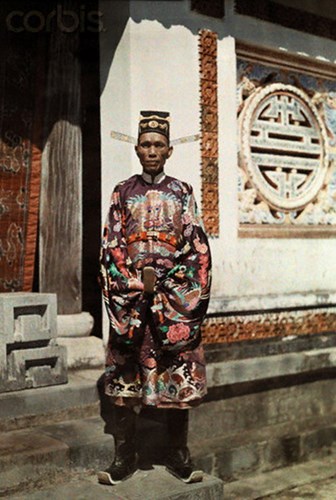 Một ông quan văn đứng trước Điện Cần Chánh ở Huế.